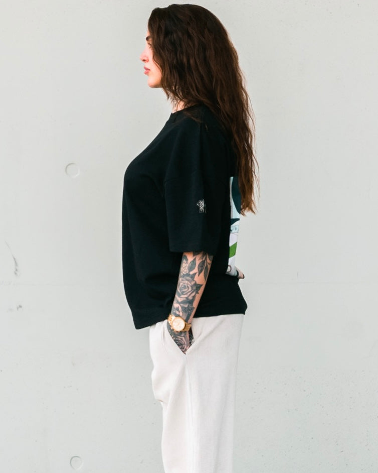Cette pièce de la collection "AMOUR DE SOI" vibre sur un t-shirt noir profond, choisi pour sublimer la symbolique de l’Amour de soi, en accueillant les hauts et les bas qui vivent à l’intérieur.