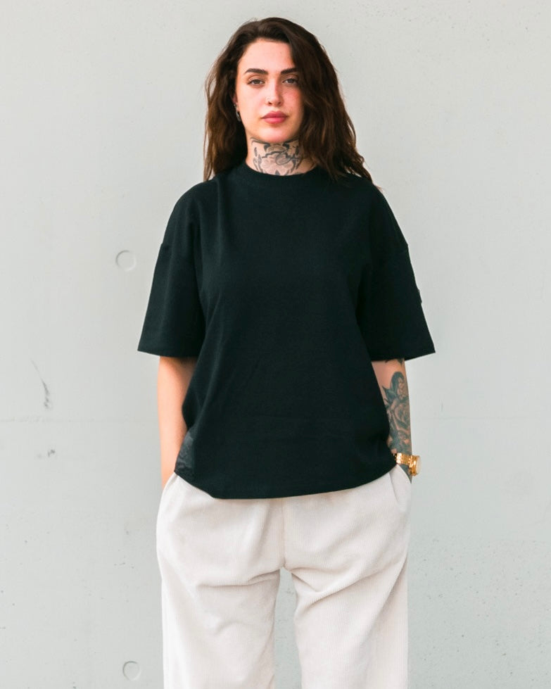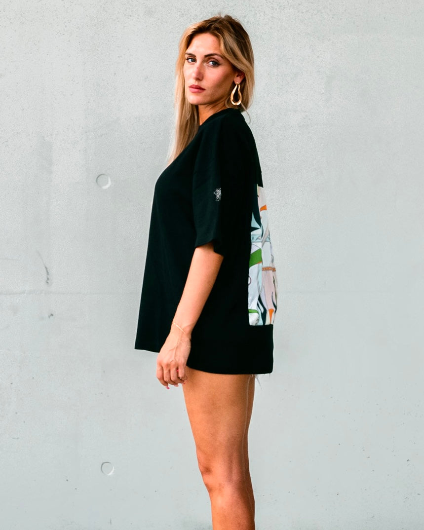 Confectionné dans un mélange épais de coton et de polyester, ce t-shirt oversize assure un confort remarquable et un style raffiné. Au dos, un imprimé en tissu français, satin de soi, évoque l’union des contraires, l’harmonie intérieure dans toutes ses dimensions. Une conscience qui observe sans juger, matérialisée dans un collage cousu main :