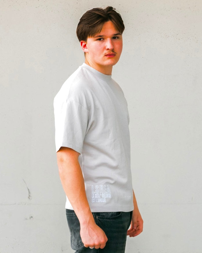 Cette pièce de la collection "AMOUR DE SOI" vibre sur un t-shirt gris perle, choisi pour mettre en valeur l'énergie créative et l'affirmation de soi.